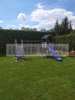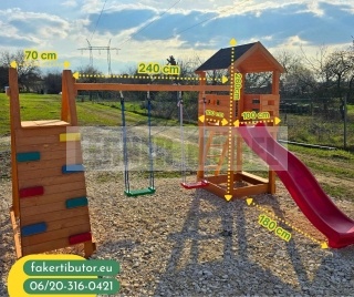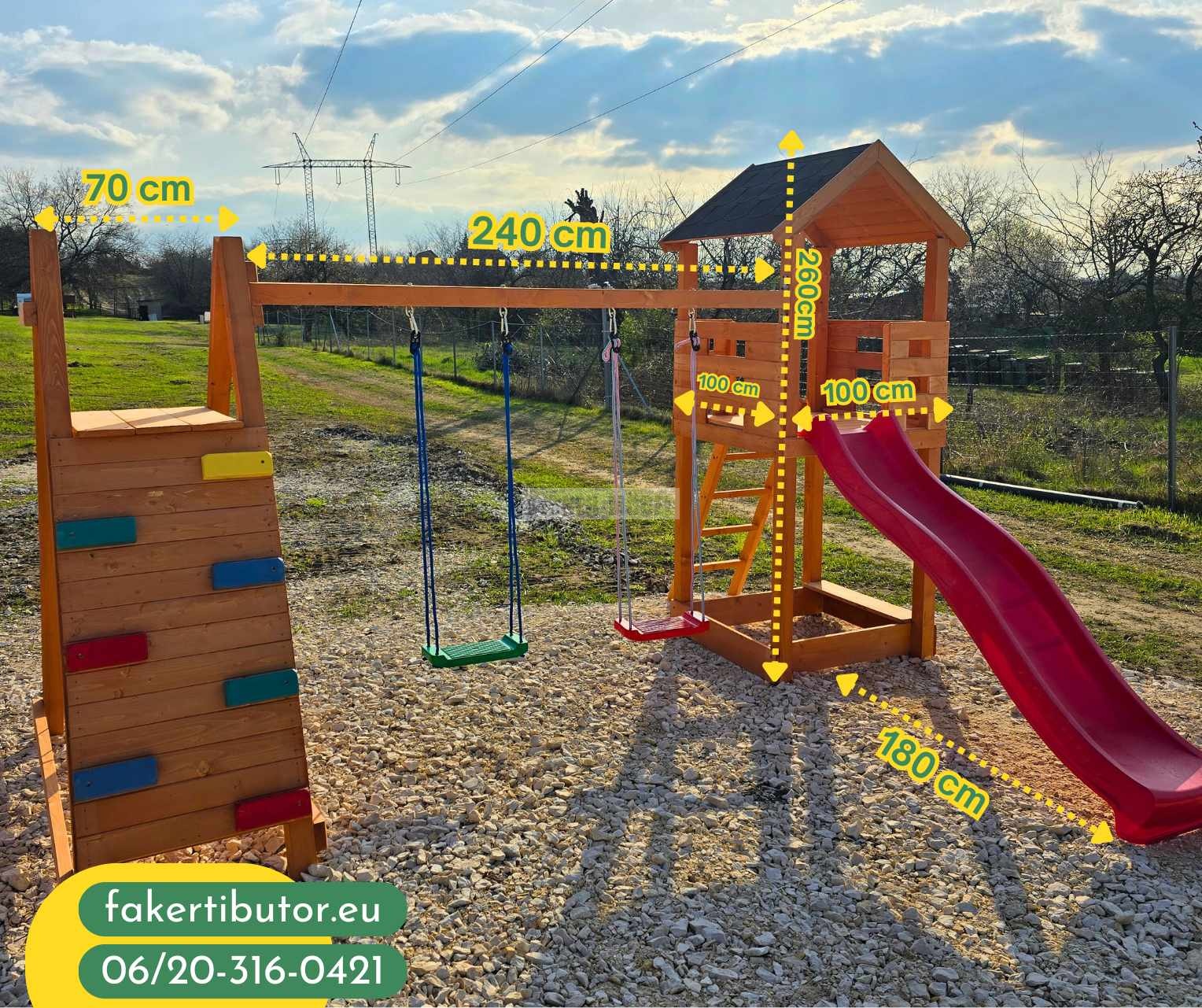 Kerti játszótér Tartós,masszív szerkezet.Anyaga : időjárásálló borovi fenyő.Felületkezelés: 2 x vékonylazúrral, integrálva. Méretek: nalapterület: 4,5 m x 3 m magasság: 260 cm torony: 105 cm x 105 cm toronymagasság: 120 cm Az ár tartalmazza :250 cm csúszda 2 hinta homokozó létra mászófal-mászóháló torony Extraként vásárolható hozzá fészekhinta + 15 000 ft-ért.